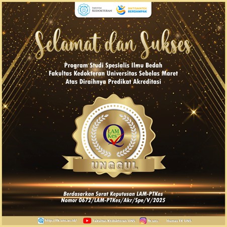 Unit Penjaminan Mutu Fakultas Kedokteran UNS mengucapkan selamat kepada Program Studi Spesialis Bedah atas diraihnya status akreditasi “Unggul” sesuai dengan SK LAM- PTKes No 0672/LAM-PTKES/Akr/Spe/V/2025. Semoga hasil akreditasi ini makin mendorong perbaikan mutu berkelanjutan. Selamat dan Sukses untuk Prodi Bedah FK UNS!!!
